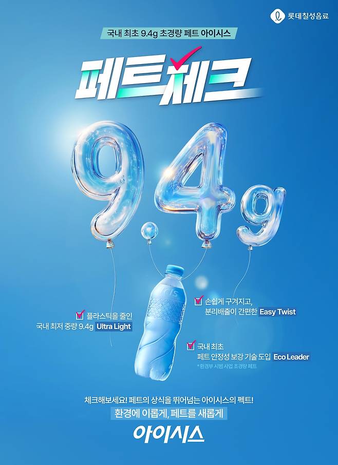 1997년 아이시스 출시 당시 용기 무게인 22g과 비교하면 약 57% 낮아진 셈이다. 롯데칠성음료는 이번 초경량 패키지 도입으로 연간 127톤의 플라스틱을 줄일 수 있을 것으로 예상하고 있다.