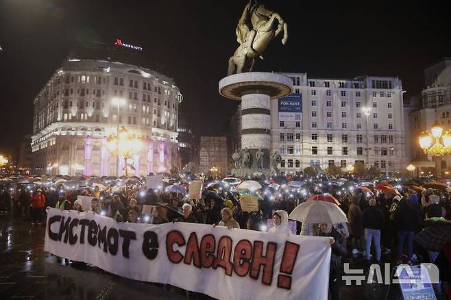 [스코페=AP/뉴시스] 24일(현지 시간) 북마케도니아 스코페에서 나이트 클럽 화재 희생자들을 위한 시위가 열려 시위대가 안전 규정, 부정부패 척결 등 사회적 시스템의 개선을 요구하는 현수막을 들고 있다. 지난 16일 코차니 나이트클럽 '클럽 펄스'에서 콘서트 도중 화재가 발생해 59명이 숨지고 170여 명이 부상했다. 2025.03.25.