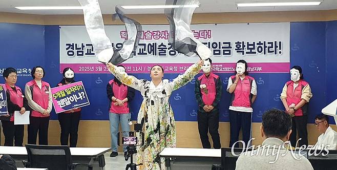 학비노조 경남지부는 회견문을 통해 "정부 예산 삭감에 따라 학교예술강사의 생계가 위협받고 있으며, 문화예술교육이 지속되어야 함을 알려왔다"라며 "경남교육청은 2025년 예산안에 25억 강사료를 확보하였으나, 문체부의 학교예술지원사업 예산안이 국회를 통과하지 못해, 학교예술강사의 실질임금은 5개월 정도 밖에 확보되지 못한 상태다"라고 설명했다.