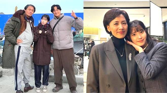 또 다른 사진에서 극 중 '학씨 아저씨'로 불리는 부상길 역의 최대훈과 중년 관식 역을 맡은 박해준 사이에 있는 아이유의 모습이 있었다. 이 사진에서 아이유는 극 중 악연으로 얽힌 최대훈을 노려보는 표정을 지어 웃음을 유발했다.