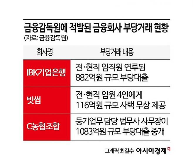 국책은행인 IBK기업은행에서 전·현직 임직원이 연루된 882억원 규모의 부당대출이 금융감독원에 적발됐다. 가상자산 거래소 빗썸은 내부통제 절차 없이 전·현직 임원 4인에게 116억원 규모의 사택을 제공한 것으로 나타났다. 금감원은 금융사들이 임직원 비위 사실을 알고서도 묵인하고, 관련 사고를 제대로 보고치 않는 등 내부통제가 작동하지 않았다고 지적하며 엄중 제재를 예고했다.