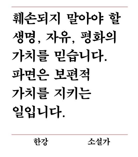 한강은 “훼손되지 말아야 할 생명, 자유, 평화의 가치를 믿습니다. 파면은 보편적 가치를 지키는 일입니다”고 밝혔다.