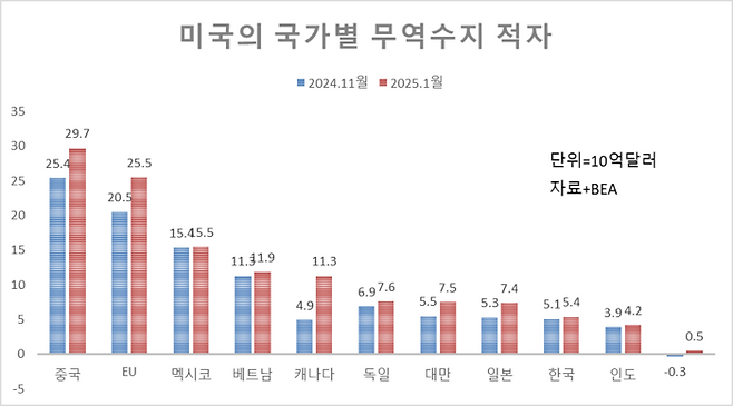 미국 무역수지 적자규모는 지난해 11월 782억 달러에서 2025년1월에는 1314억 달러로 500억 달러 이상 늘었다. 올해 1월 무역수지 적자는 지난해 1월 적자 규모 674억 달러의 2배에 달한다. 미국 기업들이 관세 부과로 수입물가가 크게 오르기 전에 미리 수입을 해놓자는 식의 가수요가 큰 폭으로 늘어난 것이 주된 이유다.