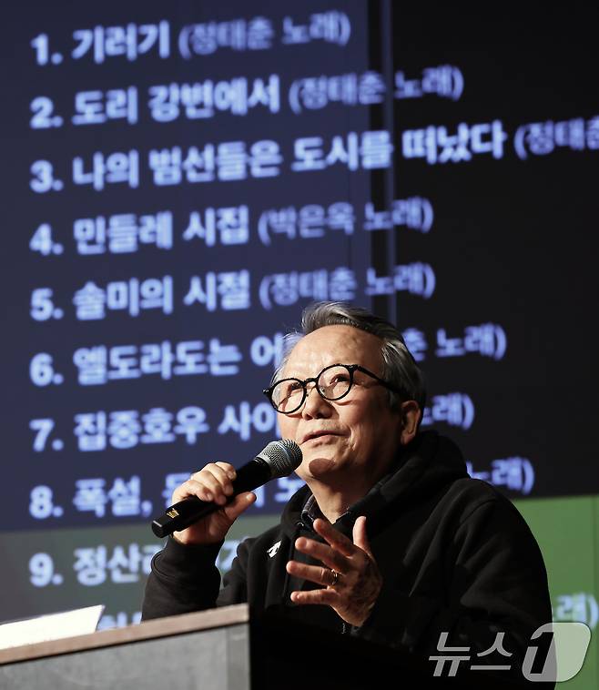 (서울=뉴스1) 오대일 기자 = 25일 오후 서울 종로구 노무현시민센터에서 열린 2025 정태춘·박은옥 문학프로젝트 '노래여 벽을 깨라' 기자간담회에서 오민석 문학평론가(단국대 명예교수)가 앨범 리뷰를 하고 있다.