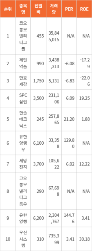 제일약품은 전 거래일 대비 990원 상승하며 거래량 3,438,313주를 기록했다. PER은 -6.08, ROE는 -17.29였다. SPC삼립은 전 거래일 대비 3,500원 상승하며 거래량 231,106주를 기록했고, PER은 6.09, ROE는 19.25였다. 한솔테크닉스는 전 거래일 대비 245원 상승하며 거래량 257,865주를 기록했다. PER은 21.20, ROE는 1.88이었다.