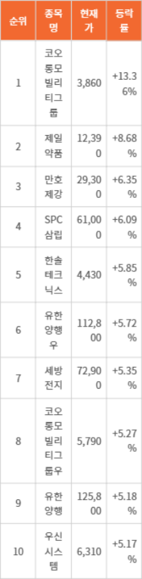 25일 한국거래소에 따르면 코오롱모빌리티그룹(450140)(003070)이 등락률 13.36%로 1위를 차지했다. 해당 종목의 현재가는 3,860원이었다. 제일약품(271980)은 12,390원으로 8.68% 상승했으며, 만호제강(001080)은 29,300원으로 6.35% 상승했다. 이어 SPC삼립(005610)과 한솔테크닉스(004710)는 각각 61,000원과 4,430원으로 6.09%, 5.85% 상승을 기록했다.
