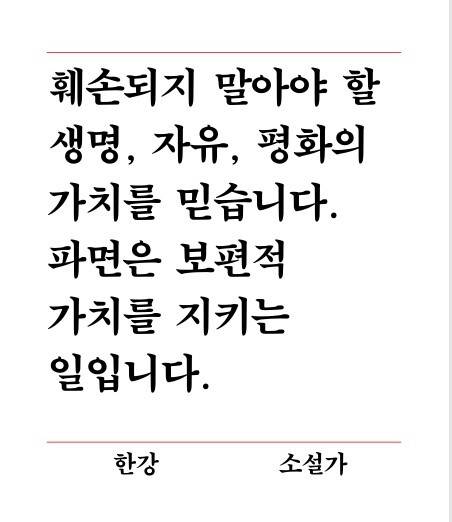 “훼손되지 말아야 할 생명, 자유, 평화의 가치를 믿습니다. 파면은 보편적 가치를 지키는 일입니다.”(한강 작가)