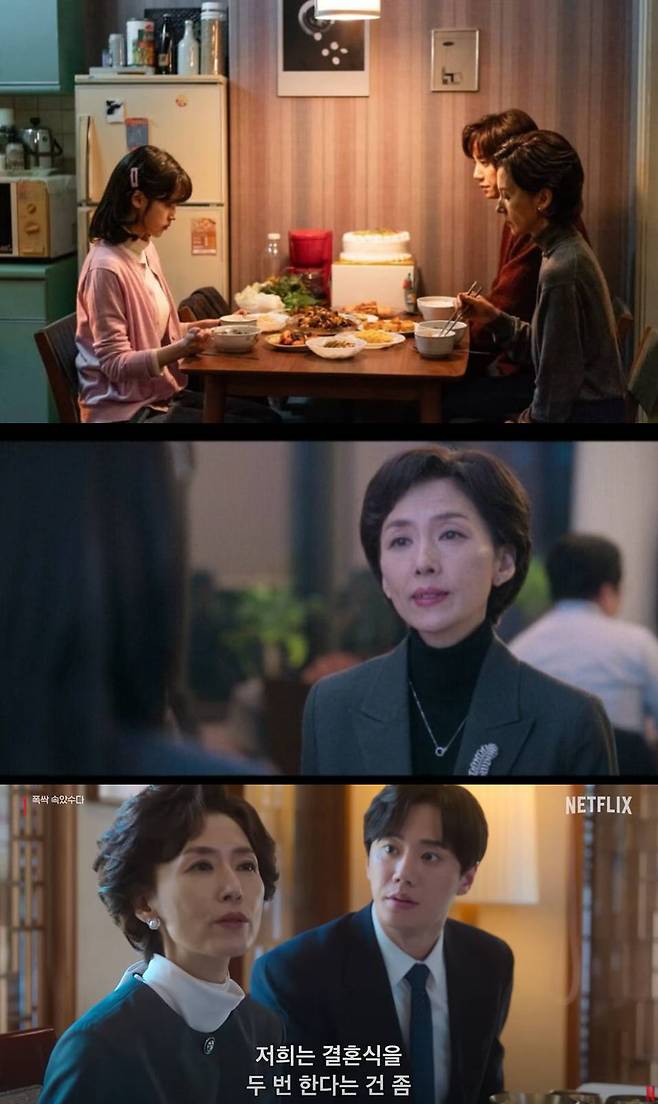 또한 세월이 흘러 집안에서 소외되고, 쇼파에 누워 런닝을 입은 채 늘어난 뱃살을 드러내는 등 현실적인 연기도 눈길을 끌었다. 미워할 수 없는 캐릭터가 되어버린 것. "역대급 진짜 빌런은 예비 시모였다"라는 반응이 계속되고 있다.