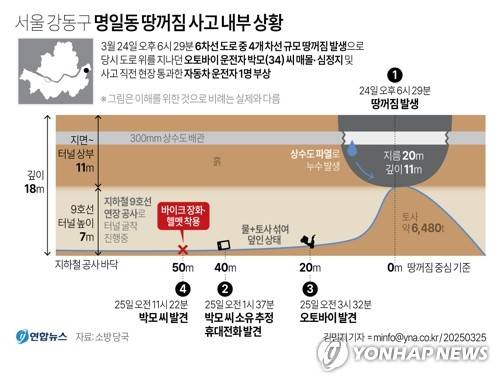 (서울=연합뉴스) 김기훈 정수연 기자 = 지난 24일 서울 강동구 명일동에서 발생한 대형 싱크홀(땅 꺼짐) 사고 원인을 두고 지하철 9호선 연장 굴착 공사와 상수도관 등 복잡한 지하 시설물이 복합적으로 작용했을 가능성이 조심스레 거론된다.