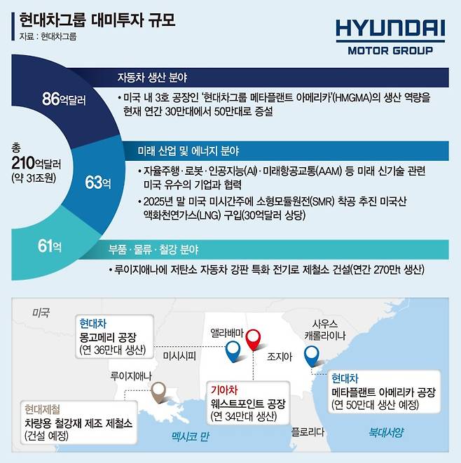 현대자동차그룹이 오는 2028년까지 미국에 투자하는 210억달러(약 31조원)는 크게 자동차 생산, 부품·물류·철강, 미래 산업 등에 투입된다. 이를 통해 공장 생산능력 확대, 제철소 건설, 미국 기업과의 신기술 협업 확대 등을 진행할 계획이다. 정의선 회장은 특히 "이번 투자의 핵심은 미국의 철강과 자동차 부품 공급망을 강화할 투자"라며 제철소 설립을 강조했다.