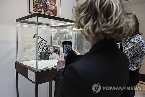 epa11987035 A woman takes pictures of archives, including the original manuscript with dialogues, parts of the script, and photographs from the film Breathless by Jean-Luc Godard, displayed to the public at Sotheby?s in Paris, France, 25 March 2025. Godard's manuscript, along with other manuscripts, will be up for auction from 04 June and 18 June 2025. EPA/TERESA SUAREZ