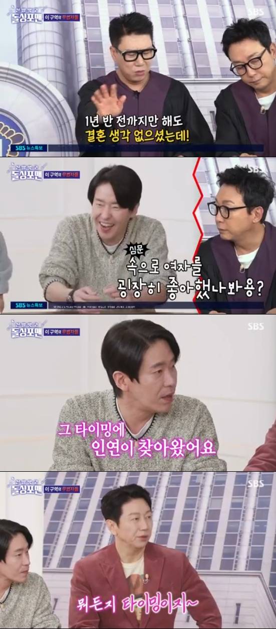 이날 '돌싱포맨' 멤버들은 결혼 4개월차 엄기준에게 대놓고 부러움을 드러냈다. 이상민은 "1년 반 전만해도 결혼할 생각은 없다고 하지 않았냐"고 물었고, 탁재훈은 "속으로는 여자를 엄청 좋아했나보다"라며 놀렸다.