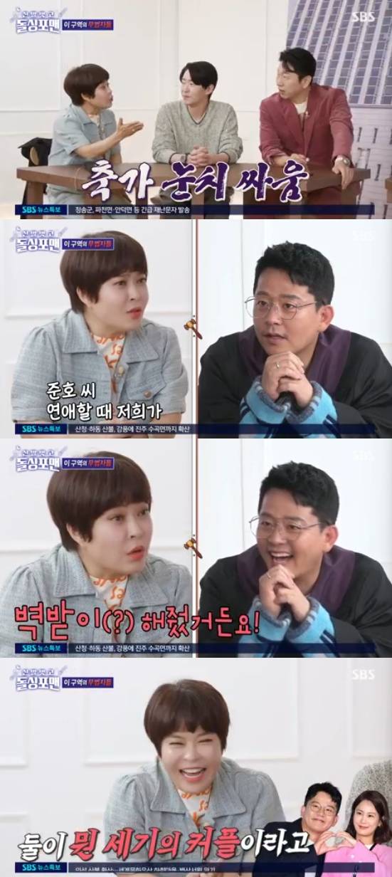 조혜련은 "김준호, 김지민이 연애할 때 제가 남편과 같이 다니면서 오해 받지 않도록 해준게 몇 년인데"라고 했고, 탁재훈은 "너네가 뭔 세기의 커플이라고"라며 돌직구를 날려 웃음을 줬다.