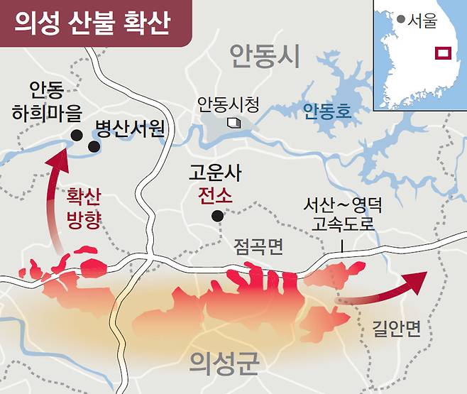 [동시다발 산불] ‘의성 산불’ 안동-청송-영덕 번져 고속도로-철도 일부 구간도 통제… 강풍에 진화율은 되레 낮아져 내일 경북 비, 최대 10㎜ 그칠듯