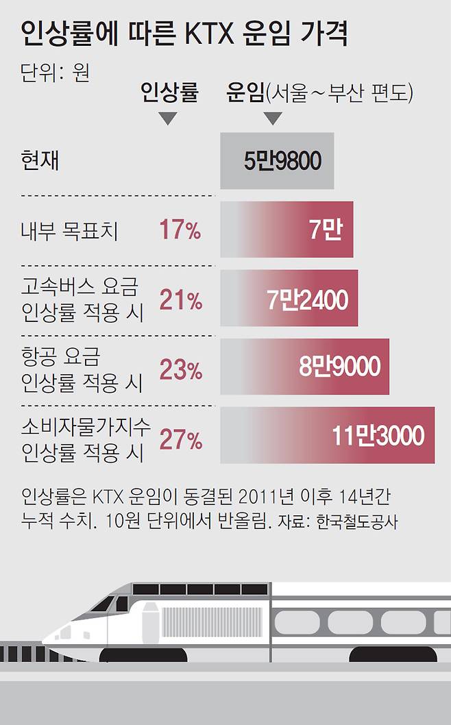 코레일이 정한 목표 인상률은 17%다. 2011년 이후 다른 교통수단 운임 인상률 등을 고려해 정한 수치다. 이 기간 동안 고속버스와 항공 운임은 각각 21%, 23% 올랐다. 항공 운임 인상률에 맞춰 인상할 경우 KTX 서울∼부산 일반 운임은 8만9000원까지 오른다.