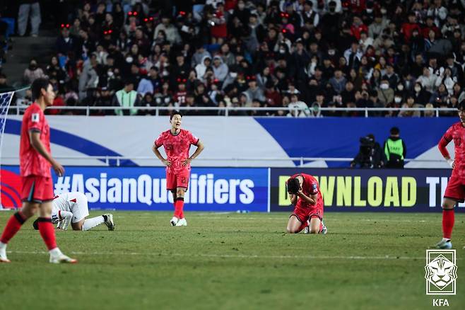 홍명보(56) 감독이 이끄는 대한민국 국가대표팀은 지난 25일 수원월드컵경기장에서 열린 요르단과 2026 국제축구연맹(FIFA) 북중미 월드컵 아시아 3차 예선 B조 8차전 홈경기에서 1-1 무승부를 거뒀다. 4승 4무(승점 16)로 선두는 지켰으나 11회 연속 월드컵 진출을 조기 확정 짓는 데는 실패했다.