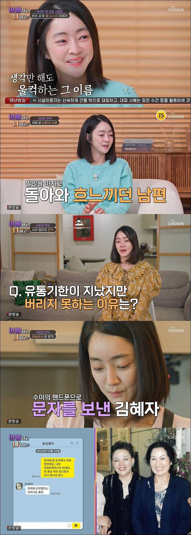 김수미가 갑작스럽게 세상을 떠난 지 5개월. 며느리 서효림은 많이 수척해진 모습으로 나타나 패널들의 걱정을 자아냈다. 서효림은 "힘들다는 선이 넘어간 거 같다. 힘들다는 걸 느끼지 못할 정도로 너무 갑작스러웠다. 작년에 어머니 돌아가시고 나서 사실 지금도 믿기진 않는다. 아무래도 매일 후회하면서 살고 있지 않나 싶다"며 힘든 심경을 털어놨다.