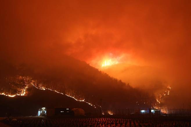 현재 현장에는 초속 0.5m 안팎의 약한 바람이 불고 있다. 산림 당국은 이날 오전 일출 직후부터 진화헬기 30대를 투입해 공중 진화 작업을 이어갈 예정이다.