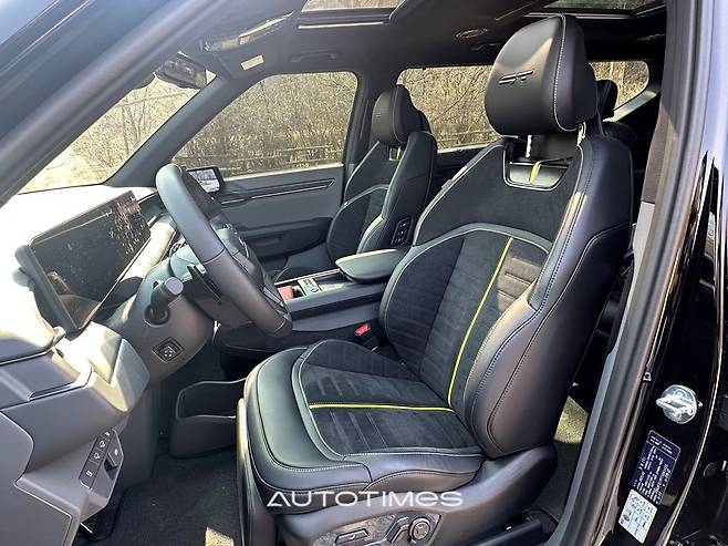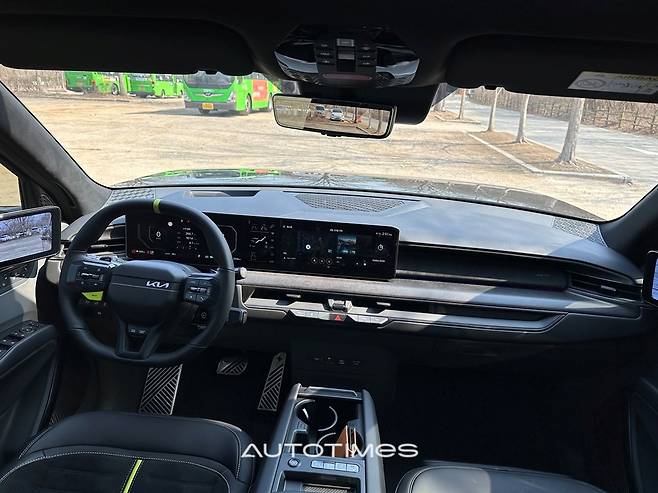 실내 역시 GT만의 분위기가 가득하다. 알칸타라 스포츠 시트와 스웨이드 마감재는 고급감과 스포티함을 동시에 품는다. GT 브랜드의 상징색인 라임색이 곳곳에 자리잡았고 헤드레스트에 큼지막하게 양각 처리한 GT 로고도 멋을 더한다. 언뜻 불편해보이지만 앉았을 때의 착좌감은 기존 EV9에서 전달했던 것 만큼이나 좋다.