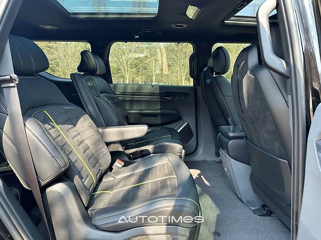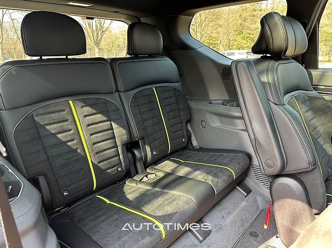 2열과 3열 시트 디자인도 달라졌다. 형상 자체는 큰 변화가 없지만 곳곳에 라임색 파이핑과 스티치를 더해 동승자들도 고성능차에 앉았다는 느낌을 확실히 느낄 수 있도록 해 준다. 2열 릴렉션 기능, 3열 전동 폴딩 및 리클라이닝 기능도 그대로여서 모두 편안하게 이동할 수 있겠다.