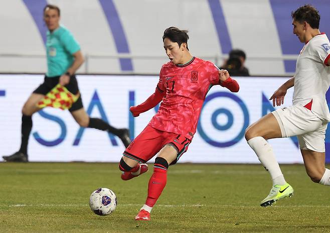 홍 감독은 이 날 손흥민을 최전방에 세웠다. 상대 수비진을 의식한 듯한 포지션 플레이를 들고 나왔다. 부상으로 이탈한 이강인을 대신해 이동경이 출격했고 이재성, 황희찬이 2선에 섰다. 하지만 경기력은 전반전에만 활발했다. 황인범의 패스를 중심으로 초반 적극적인 침투 플레이가 펼쳐졌다. 손흥민의 코너킥이 이재성 앞으로 날아가고, 이재성이 이를 마무리하며 한국의 선제골이 펼쳐졌다.