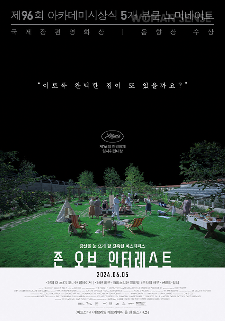 아우슈비츠 강제수용소 담장 밖에서 평화로운 생활을 누리는 ‘루돌프 회스’ 장교 일가족의 일상을 그린 작품. 강제수용소 담장을 사이에 두고 벌어지는 희극과 비극, 극과 극의 상황을 생생하게 담아 섬뜩한 공포감을 불러일으킨다. 영화 <미드소마> <에브리씽 에브리웨어 올 앳 원스> 등을 선보인 제작사 A24의 작품으로 2023년 제76회 칸영화제에서 4관왕, 2024년 제96회 아카데미 시상식에서 2관왕의 영예를 안았다.