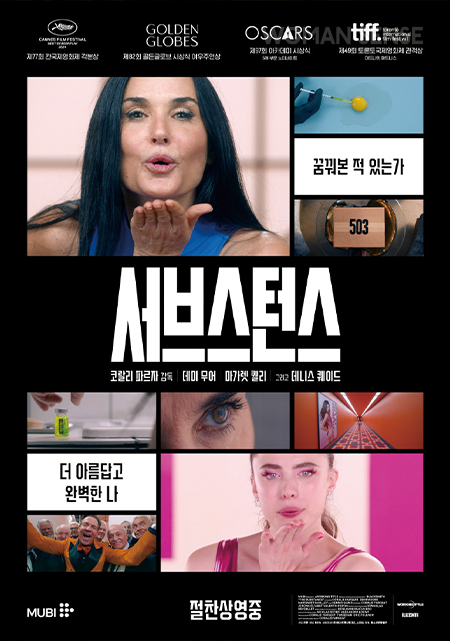 지난해 5월 칸영화제 경쟁 부문에 초청돼 최초 공개된 <서브스턴스>는 세계적인 톱스타 데미 무어와 지금 가장 핫한 배우 마가렛 퀄리의 역작이다. 나, 그리고 더 나은 버전의 나와의 숨 막히는 대결을 그린 스릴러다. 과감한 연출력과 두 주연 배우의 불꽃 튀는 열연, 아름다운 미장센까지, 완벽한 작품이라는 호평과 함께 한 치 앞을 예상할 수 없는 광기 어린 전개로 “미친 영화”라는 찬사를 받았다.