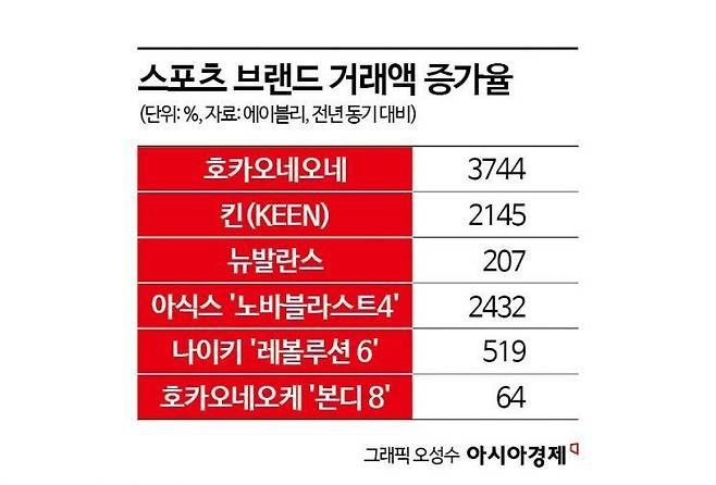 스포츠 브랜드의 경우 '호카오네오네'와 돌풍을 일으켰다. 에이블리에서 글로벌 스포츠 아웃도어 브랜드 호카오네오네 거래액은 1년 전보다 무려 38배 이상(3744%) 증가했다. 아웃도어 슈즈 브랜드 킨도 전년 대비 22배 이상(2145%) 거래액이 늘었다. 이외에도 글로벌 스포츠 브랜드 뉴발란스의 에이블리 내 거래액도 3배 이상(207%) 증가했다.