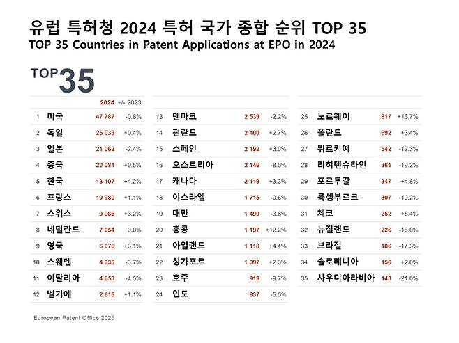 한국이 2년 연속 유럽 특허청 출원 건수에서 상위 5위권에 들었다. 인공지능(AI)과 배터리 관련 특허출원이 급증한 가운데 기업별로는 삼성, LG가 각각 1, 3위에 오르며 기술혁신을 이끌었다.