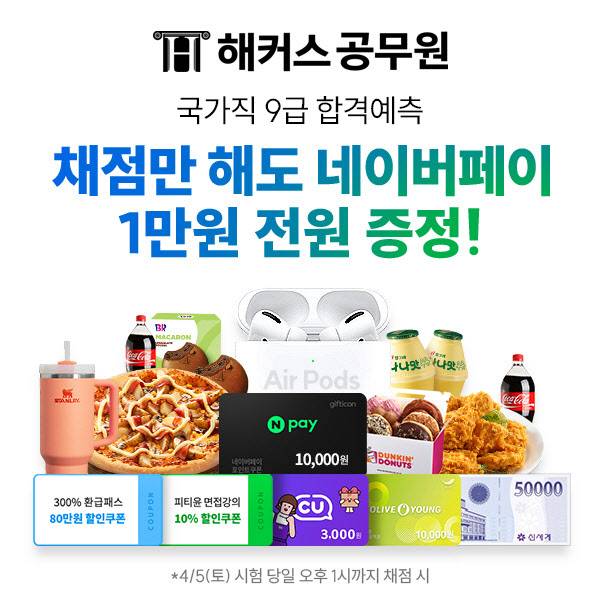 4월 5일 국가직 9급 시험일 당일에는 채점 이벤트를 진행해, 시험 당일 오후 1시까지 채점한 전원에게는 네이버페이 1만 원을 제공하며, 오후 2시까지 채점 시 네이버페이 9000원, 오후 3시까지 채점 시 네이버페이 5000원을 전원에게 제공한다.