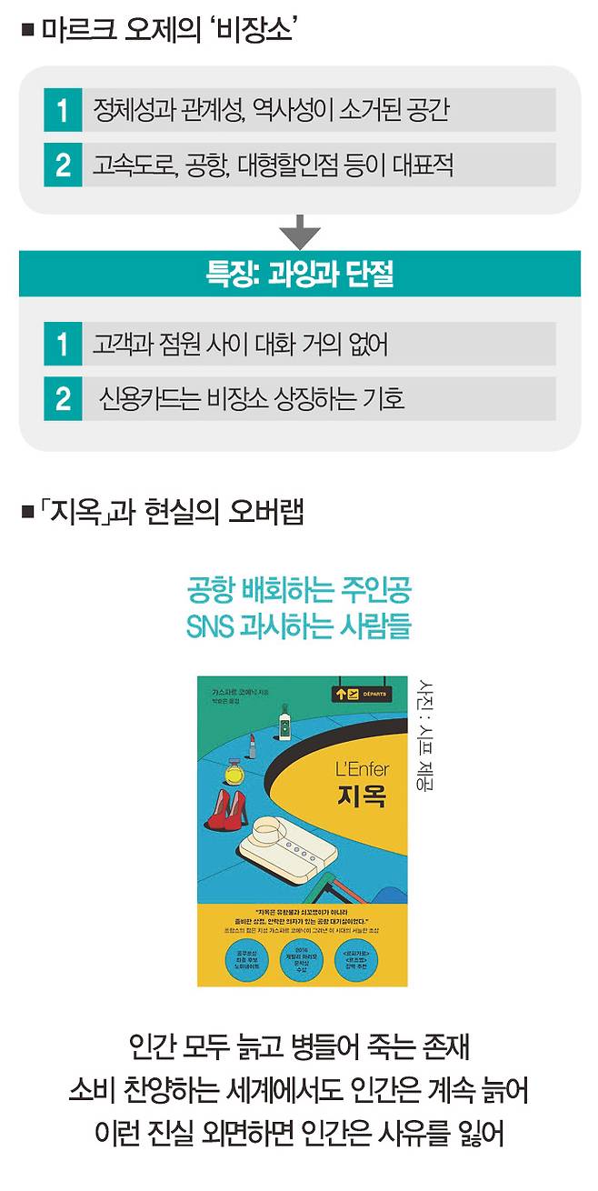 프랑스 철학자 마르크 오제는 '비장소'라는 개념을 제시하면서 정체성과 관계성, 역사성이 소거된 공간이 늘어난다고 지적한 바 있다. 고속도로, 공항, 대형할인점 등은 이미지에 의한 매개를 통해 경험되는 대표적인 비장소의 공간이다.