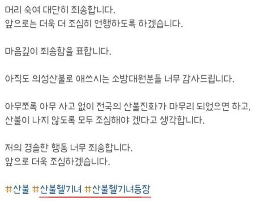 다만 이 같은 사과에도 온라인에서는 비판의 목소리가 제기됐다. A 씨가 사과문에 붙인 ‘산불’ ‘산불헬기녀’ ‘산불헬기녀등장’ 이라는 해시태그 때문이다.