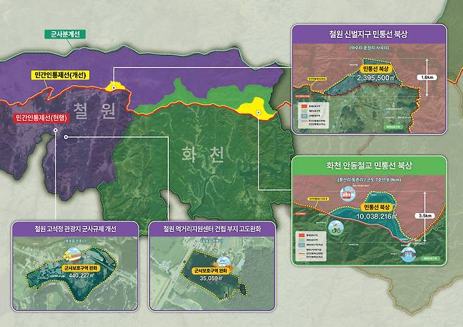 규제가 해소되는 곳은 철원군 신벌지구(와수리‧운장리‧사곡리) 민통선 1.6km 북상 2.39㎢, 화천군 안동철교(풍산리‧동촌리) 민통선 3.5km 북상 10.04㎢, 철원 고석정 관광지와 먹거리 지원센터 0.47㎢다.