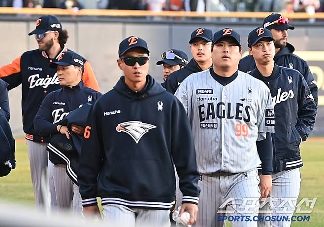 점퍼를 입은 류현진이 러닝으로 땀을 낸 뒤 캐치볼에 나서자 한화 와이스, 폰세, 엄상백, 문동주 등 선발투수진이 그의 등판 준비에 함께 했다.