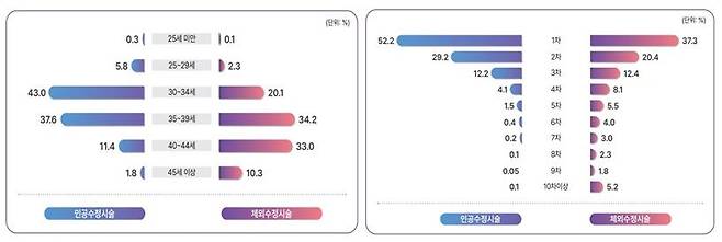| ▲ 2022년 난임시술별 연령 현황(왼쪽) / 2022년 난임시술별 시술 횟수(차수) 현황(오른쪽) |