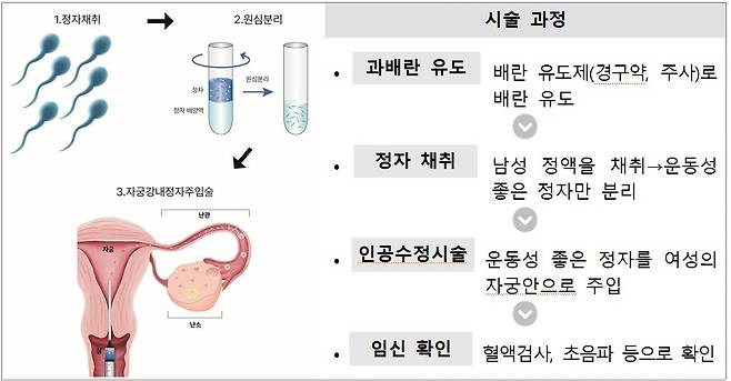 | ▲ 인공수정시술 여성의 배란기에 맞추어 남성의 정자를 자궁 안으로 주입하는 시술로, 여성 체내에서 수정이 이루어지는 시술 |