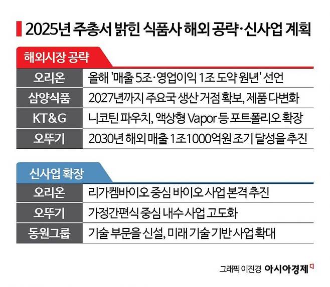 국내 주요 식품기업들이 올해 정기 주주총회에서 글로벌 시장 확대와 신사업 강화를 양대 축으로 내세우며 중장기 성장 전략에 본격 시동을 걸었다.