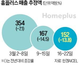 26일 대체 데이터 플랫폼 한경에이셀(Aicel)에 따르면 홈플러스의 3월 셋째주(16~22일) 카드 결제 추정액은 전년보다 13.8% 줄어든 152억1400만원으로 집계됐다. 첫째주 354억원이던 카드 결제액이 둘째주 167억원으로 떨어지더니 셋째주에 또 줄었다. 3주 연속 전년 대비 하락률이 두 자릿수를 기록했다.
