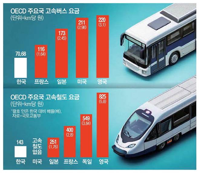 경제협력개발기구(OECD) 주요국 대중교통 요금을 비교하면 한국이 훨씬 저렴한 것으로 나타났다. 고속버스의 경우 미국은 한국의 2.98배, 영국은 3.1배, 프랑스는 1.64배 비싼 것으로 조사됐다. 고속철도의 경우 영국은 5.8배, 프랑스는 2.8배, 독일은 3.84배, 일본은 1.76배 비쌌다. 한국과 소득이 거의 비슷한 일본과 비교해도 대중교통 요금이 많이 차이가 난다. 다만 기획재정부는 대중교통 요금 인상에 부정적인 입장인 것으로 알려져 실제 인상까지는 난항이 예고됐다.