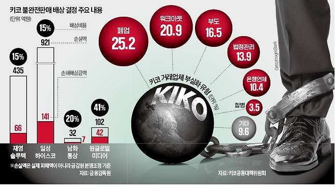 2010년 이전 환헤지 통화옵션 파생상품인 키코(KIKO)로 손실을 본 재영솔루텍, 일성하이스코, 남화통상, 원글로벌미디어 등 4개 중소기업이 시중은행을 상대로 소송에 나선다. 금융감독원이 2019년 12월 시중은행의 키코 불완전판매 책임을 물어 4개 기업에 배상하도록 조정 결정을 내렸으나 6년이 지나도록 이행하지 않아서다.