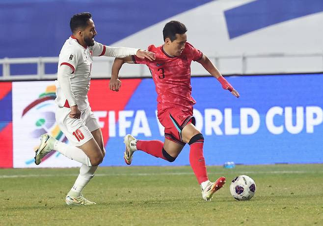 | ▲ 25일 경기도 수원시 수원월드컵경기장에서 열린 2026 북중미 월드컵 아시아 3차 예선 B조 8차전 대한민국과 요르단의 경기. 이태석이 드리블을 하고 있다. |