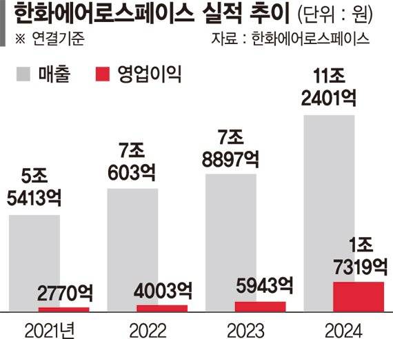 지난해에는 매출 11조2401억원, 영업이익 1조7319억원의 실적을 올렸다. 최근 5년간 방산 계열사 통합과 한화오션 인수 등 7조1706억원을 투자해 매출과 영업이익이 각각 114%, 948% 증가했다.