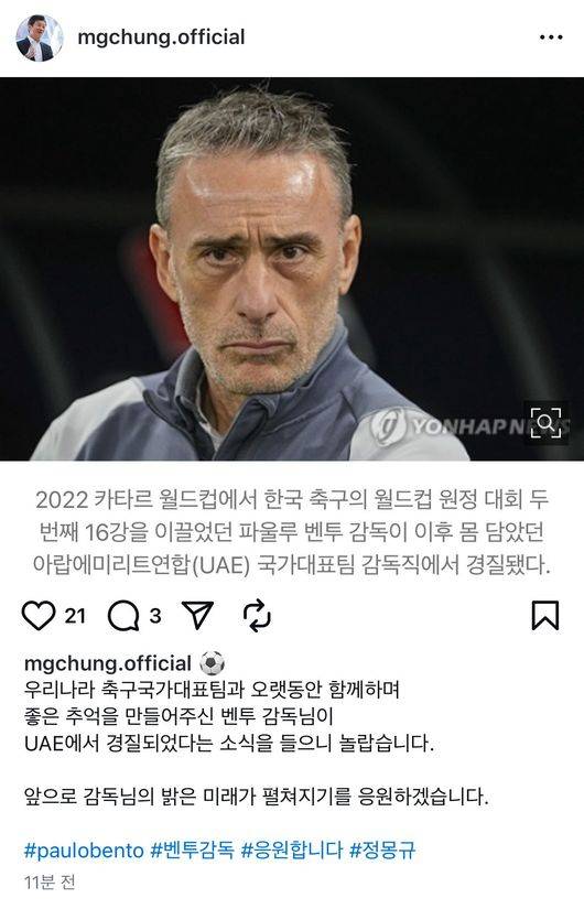 정몽규 KFA 회장도 자신의 공식 SNS에 벤투 감독에 대한 글을 남겼다. 그는 "한국 축구 대표팀과 함께하면서 좋은 추억을 만들어주신 벤투 감독이 UAE에서 경질당했다는 소식을 들으니 놀랍다"라면서 "밝은 미래를 기원해본다"라고 강조했다.