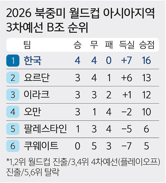 한국은 26일 현재 4승4무(승점 16)로 2026 FIFA 북중미 월드컵 아시아 지역 3차 예선 B조 선두를 달리고 있다. 오만, 요르단과의 경기에서 잇달아 무승부를 기록하며 조기에 월드컵 본선 진출을 확정하지 못했지만 운이 따라줬다. 이라크가 이날 팔레스타인에 충격적인 1-2 역전패를 당하면서 6월5일 예정된 이라크와의 원정 9차전에서 반드시 승리해야 한다는 부담을 덜게 됐다. 이라크가 3승3무2패(승점 12)로 조 3위에 머물면서, 한국은 남은 이라크, 쿠웨이트전에서 승점 1만 따내도 조 2위를 확보할 수 있게 됐다. 이번 북중미 월드컵에서 아시아축구연맹(AFC) 가맹국에 할당된 월드컵 본선 티켓은 8.5장이다. 3차 예선 각 조 1~2위가 본선에 직행하고, 조 3~4위는 4차 예선을 통해 다시 도전하는 구조다. 한국이 이라크전에서 무승부만 해도 11회 연속(통산 12회) 월드컵 본선에 나가게 된다.