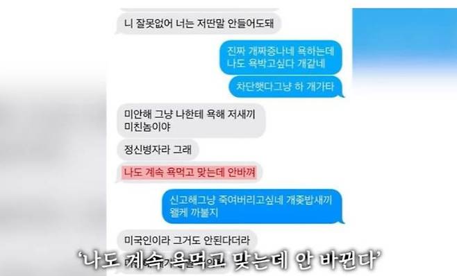 김새론은 전 남친에게 "미안해 그냥 나한테 욕해 저 XX 미친놈이야. 정신병자라 그래. 나도 계속 욕 먹고 맞는데 안 바뀐다"라고 적었다. 다른 메시지에서는 "내 인스타부터 다 해킹해서 사진 올리고 때리고 욕하고 너무 무서웠어, 그래서 헤어지지 못했고, 이게 너한테 피해가 갈까 늘 두려웠어"라고 전했다.
