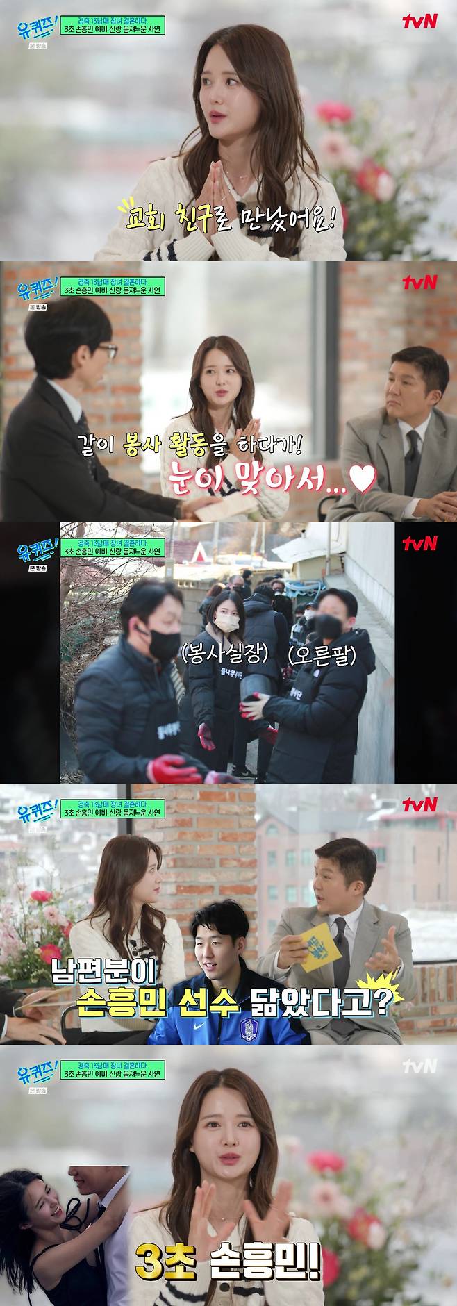 이에 조세호는 "들리는 소문에 의하면, 남편 분이 굉장히 훤칠하시고 손흥민 선수 닮았다고 하시더라. 가족 분들이 보시기엔 어떠시냐"라며 5남매에게 물었다.