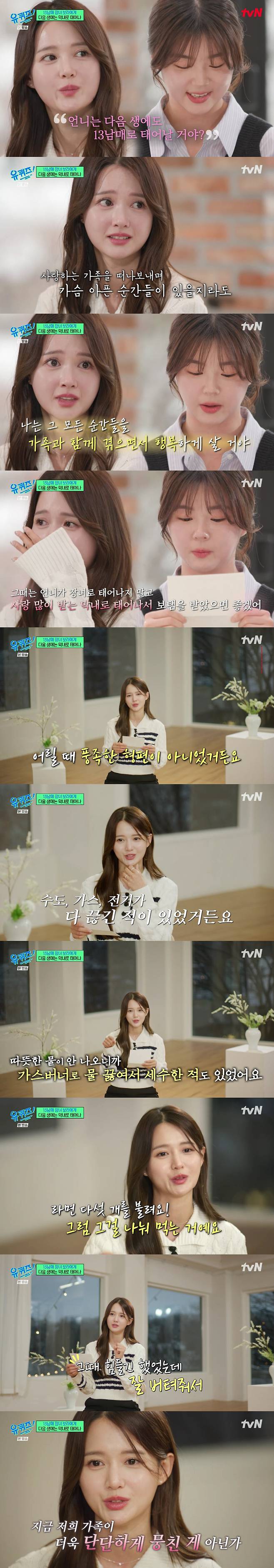 이를 들은 남보라는 "감동이다"라며 "저희가 어릴 때 풍족한 형편이 아니었다. 수도 가스 전기가 다 끊긴 적도 있었다. 촛불을 키고 가스버너로 물 끓여서 세수하고 학교 간 적이 있다. 라면 다섯 개를 불린 다음 같이 나눠먹기도 했다. 근데 아무도 불평한 사람이 아무도 없었다. 힘들긴 했는데 잘 버텨줘서 지금 저희 가족이 단단하게 뭉친 것 같다"라며 눈물을 흘렸다.
