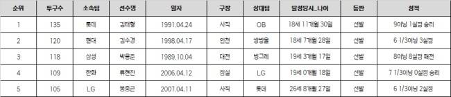 다만 고졸신인투수가 데뷔 등판에서 120개를 넘긴 경우는 흔치 않았다. 역대 고졸루키 데뷔전 최다투구수 2위였다. 1위는 롯데 김태형이 1991년 135구를 던진 바 있다. 120개를 넘긴 것은 1998년 4월 17일 인천 쌍방울전에서 현대 김수경(120구) 이후 27년 만이다. 류현진도 2006년 데뷔전에서 109개를 던졌다. 시즌이 빨리 시작한 3월 첫 등판에서 100구를 넘긴 것도 이례적이다.