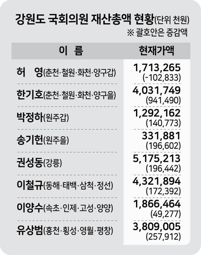 이 밖에 도출신 의원 중에는 △춘천고 출신 윤호중 21억6111만원 △양구 출신 정성호 46억234만원 △강릉고 출신 김병주 12억4434만원 △강릉출신 김우영 3억5694만원·김현 7억6831만원 △정선출신 송재봉 4억3806만원 △춘천출신 진종오 30억1495만원 △강원초등교사 출신 백승아(비례) 5억4575만원으로 각각 신고됐다.