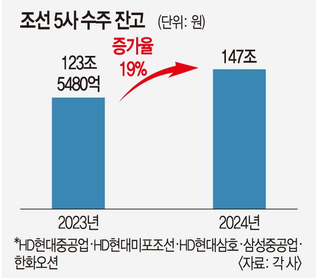 지난해 말 기준 조선사 5곳의 수주 잔액은 약 147조원으로 2023년 123조5480억원 대비 19% 증가했다.